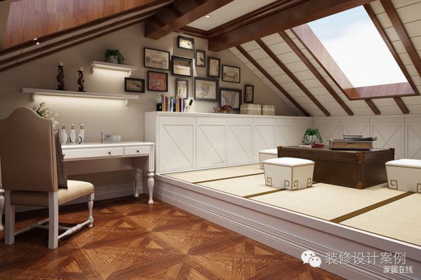 阁楼中巧妙利用空间,将照片墙置于顶角,和榻榻米相生出趣味而实用的空间。在这个空间抬头便是蓝天美景,外景内置,可谓别样精彩。