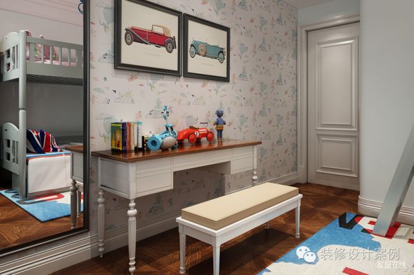 儿童房中蓝与红的汽车简画在卡通壁纸的映衬下更显萌魅。