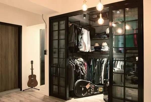 ▲设计师还给业主做了一个衣帽间,从这里看出来业主是个衣服很多的人。玻璃木格框的双开门片和U型层架,收纳量相当可观。