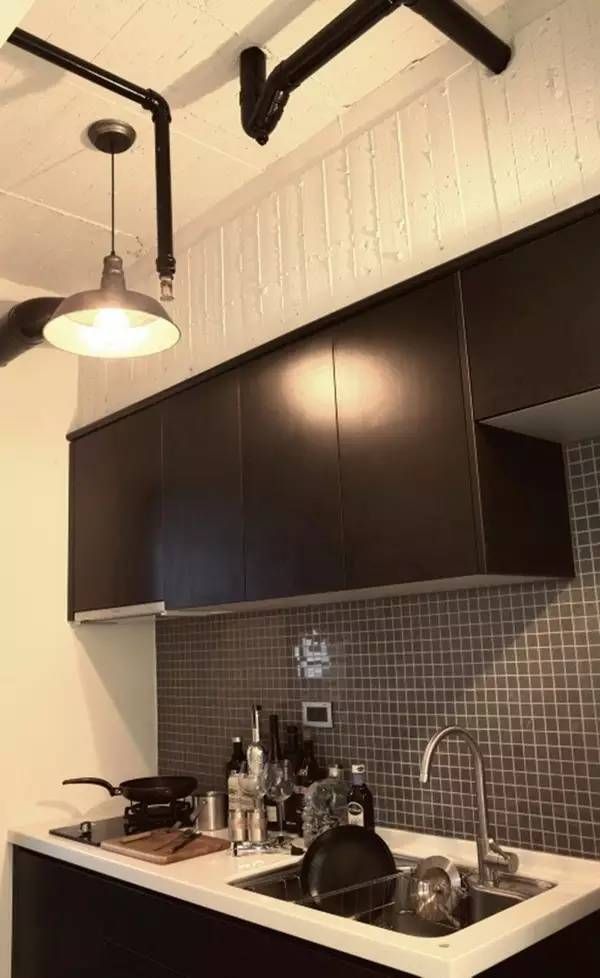 ▲黑色橱柜上方的樑柱,是拆除天花板后裸露的板模线条,保留这片粗糙面,更显得原始。
