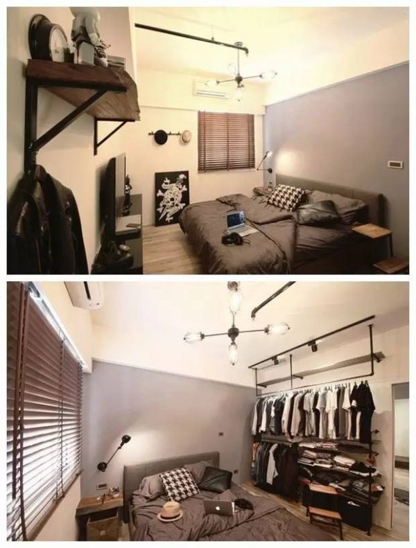 ▲以工业风元素及吊灯做为搭配,并搭配出业主偏爱的铁灰藏蓝色墙面,让空间温润有余。铁件木层板架构出开架式衣柜,床框让睡眠时更为放松舒适。