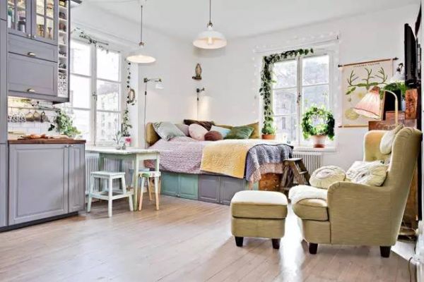 ▲ 小户型的房子不宜摆放过多柜子。房主深谙其中道理,聪明地把收纳柜藏在沙发床下,小空间免去了拥挤压迫的尴尬