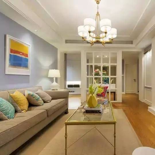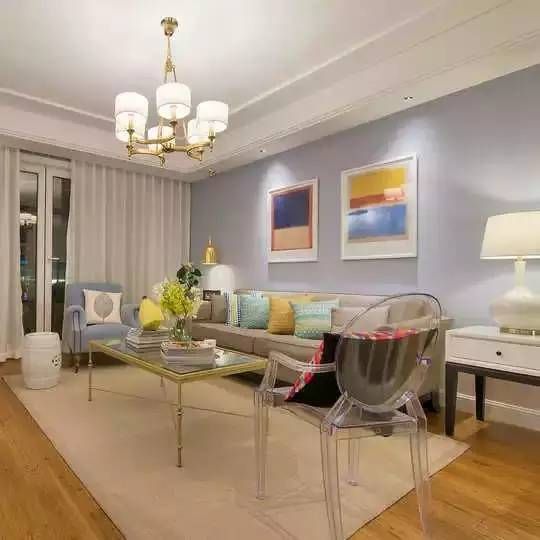 “现代与美式相融,时尚与风格兼具”------整体客厅空间以蓝、灰、米、金色合成一气,没有太过累赘的装饰,简约但不失个性,点点细节透露着美式风情。
