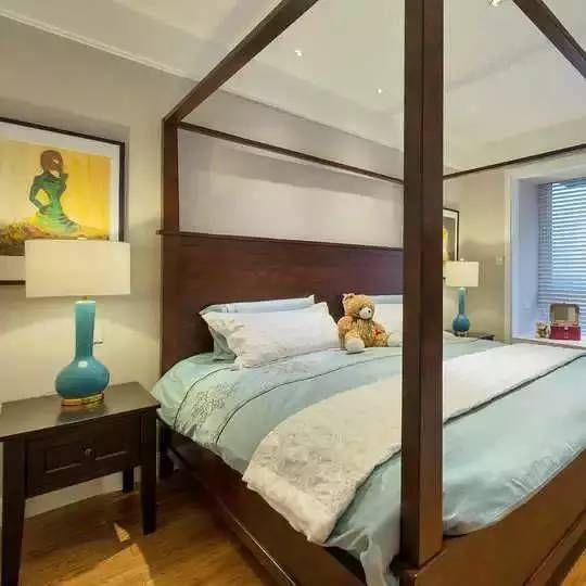“轻罗纱幔,相拥浪漫”-------于是乎,挂着纯白纱幔,轻柔飘逸的四柱床便成了卧室主角。灯光温柔亮起,床品花枝蔓延,一份纯爱浪漫情油然而生。