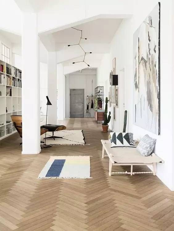 玄关人字拼花和客厅直纹铺贴