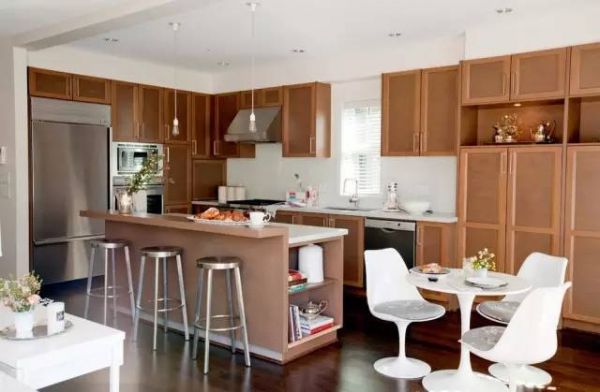 如果你拥有不错的审美能力,而且希望开放式厨房开起来更有品质感,那么不放尝试原木纹路色调的厨柜。