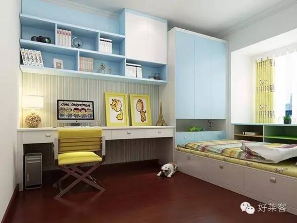 蓝色是纯净的颜色,孩子的专属空间应和孩子的纯真与懵懂。榻榻米侧开床,掩门无拉手衣柜,窗前设搁板飘窗,一侧墙面设书桌、书柜,合理地划分了使用空间。