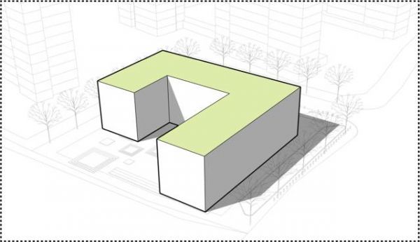 在方案设计初期,建筑以一个简洁U型楔入场地,限定出半围合的庭院空间。形体通过单元化空间组织以及对屋顶的造型处理,营造出别具一格的建筑“群落”。丰富的建筑形态,让人仿佛游走在一个迷你城镇之中,构建了一种轻松愉悦的场所氛围。