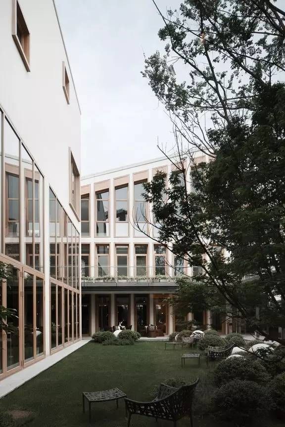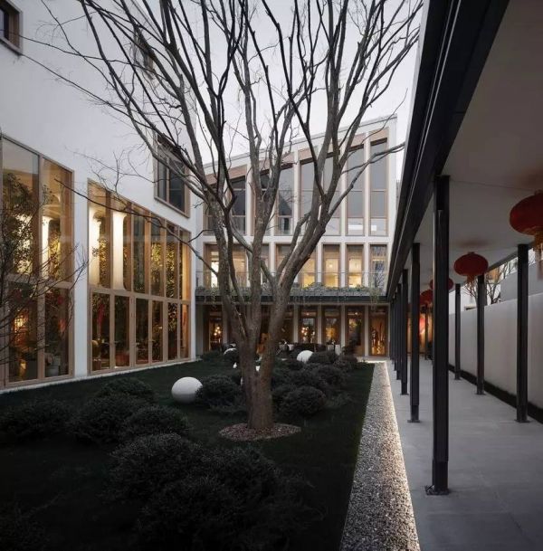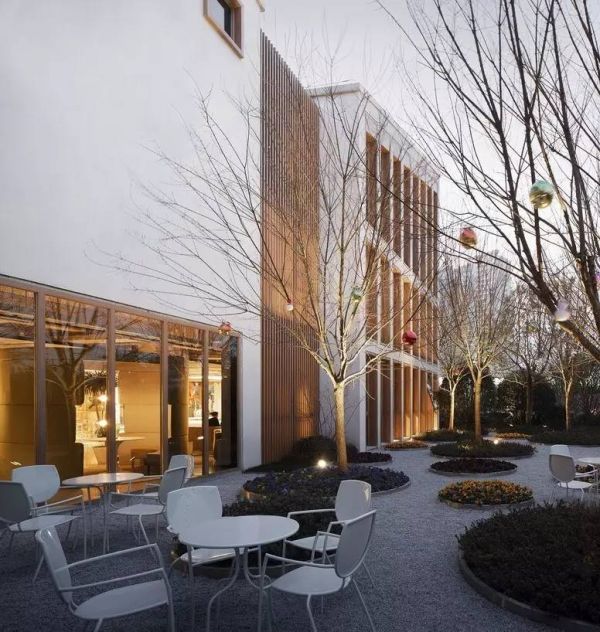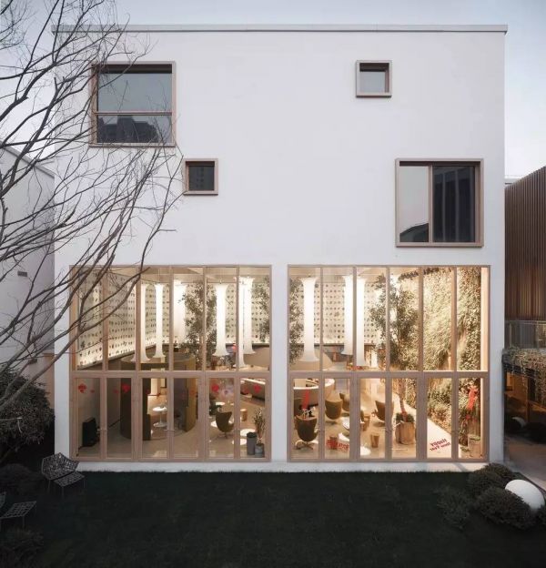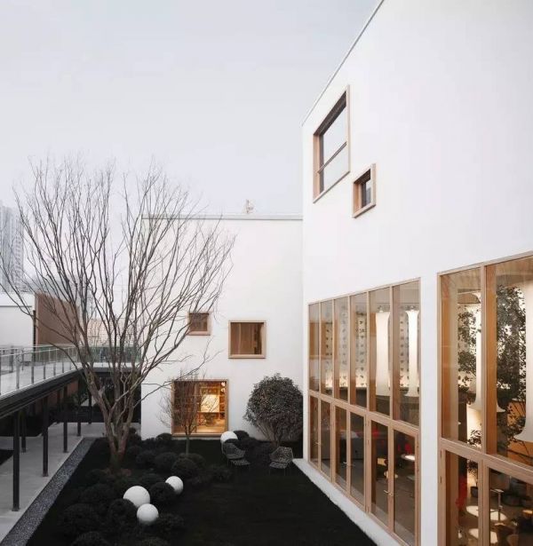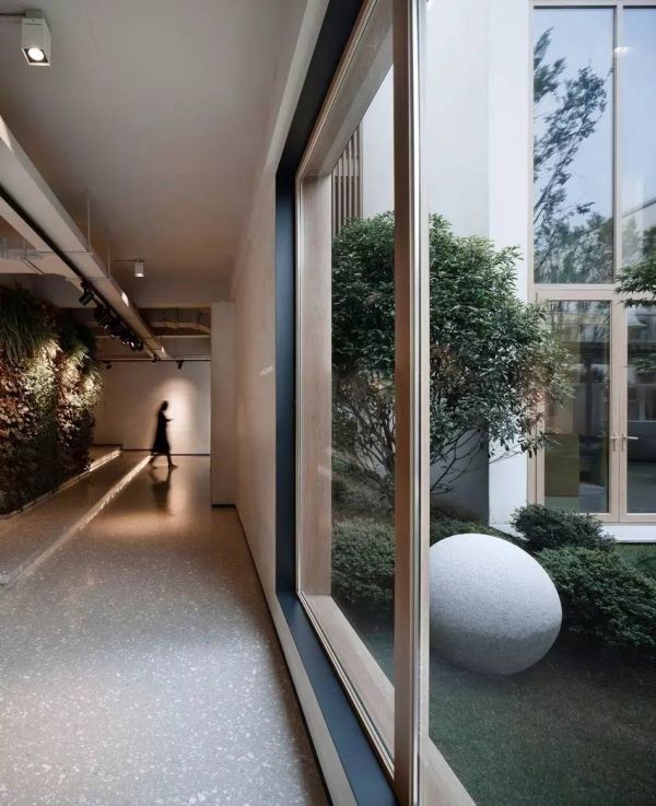 室内的功能空间与室外的庭院空间的自然过渡也是这个项目的特色之一。围合庭院空间的界面运用了大面积的玻璃幕墙,弱化了界限,将人在室内的视野全面打通。使每一个进入生活体验馆的人,第一眼就能看见设计精致、品味优雅的内庭院,实现了室内外空间的延伸和渗透,在有限的地块内创造出了丰富的空间效果。