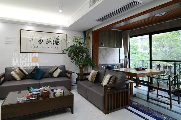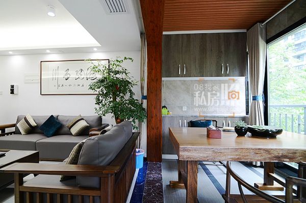 入户进来,直接进入客厅。以一中式屏风稍做隔断,避免视线的直视。客餐厅均无过多装饰造型,简单吊顶,甚至没有主灯,以灯带及筒灯做为照明光源。电视背景装饰以大理石砖,与其他区域区分。而沙发背景则是一幅大气的书法作品做为整个客厅的亮睛之笔。二楼的楼层,让房间都包围在小区花园的绿荫之中,坐在阳台上,泡壶茶看看书,阳光透过叶子撒在身上,看看窗外的风景,舒适而随意,真乃人生之乐趣。