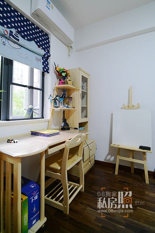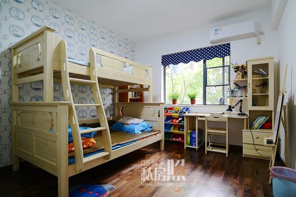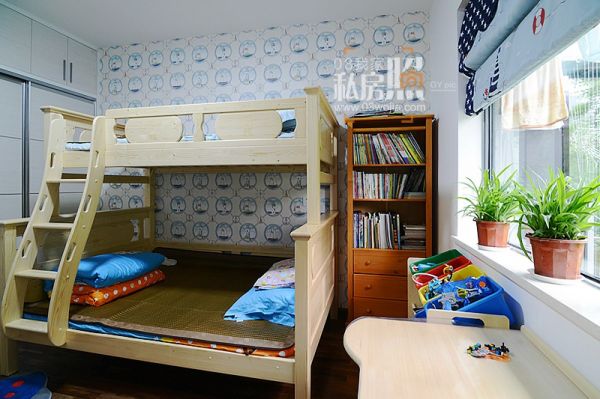 向左,是儿子的自由天地。读书或是画画,在高低床爬上爬下的玩耍,或是摆弄心爱的玩具,为儿子营造自由成长的空间是妈妈对孩子的爱。蓝色的元素出现在壁纸和窗帘上。