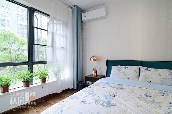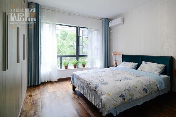 卧室,最让人放松的个人空间。也是最让欢欢佗最感觉平静的地方,窗帘与床品上下呼应的淡雅的蓝色让人心灵平和。