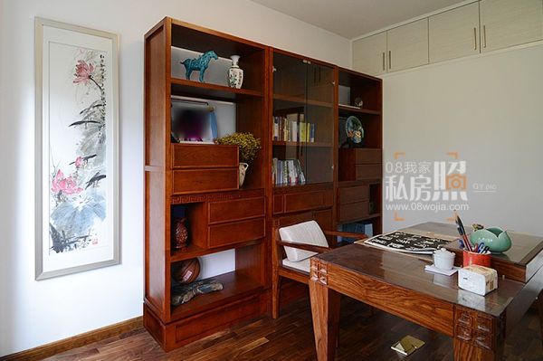 转到书房,这是一个传承传统的地方。传统刺猬紫檀的家具和纹路,如历史的厚重,让传统技艺在此延续。门后是一间小客房,用于父母过来小住。