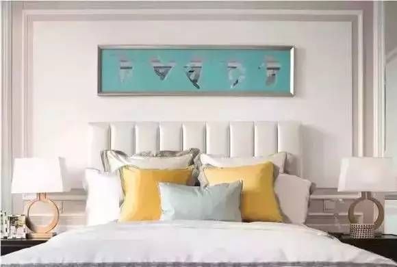 组合式配色法:卧室空间除了依旧是白色主调外,同纬度的孔雀绿和孔雀黄继续作为主要点缀色连贯着整个居家空间,散布在装饰画、抱枕中,用这两种清新怡人的色彩,组合成一个色彩围合,墙面上的椭圆挂饰起到了绝对的领袖作用。