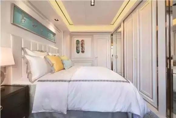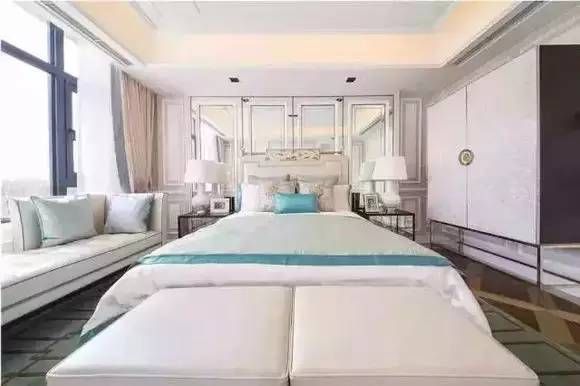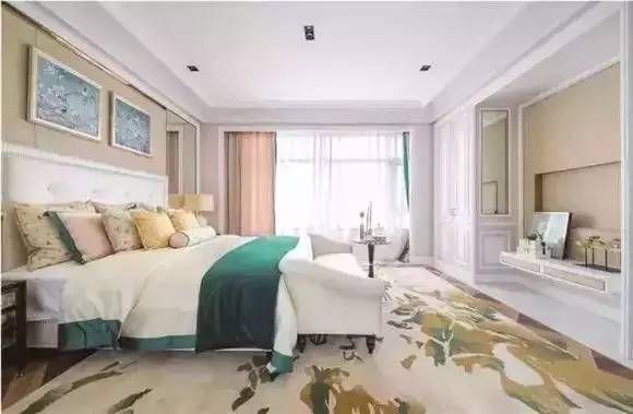 不同纹样的结合配色:这一卧室空间采用了孔雀绿和孔雀蓝的间色作为点缀色,床搭的纹样装饰画相同,所有的家具和布艺均采用蓝色压边,与硬装和地毯呼应;值得一提的是地毯纹样是有别于其他布艺的,与硬装线框呼应的纹样在这个空间起到领衔作用的同时避免碎花纹样造成泛滥。