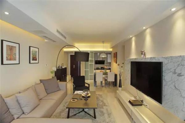 在空间的结构设计上完美的结合了灯光,电视墙采用的是爵士白大理石来提升整个空间的质感。