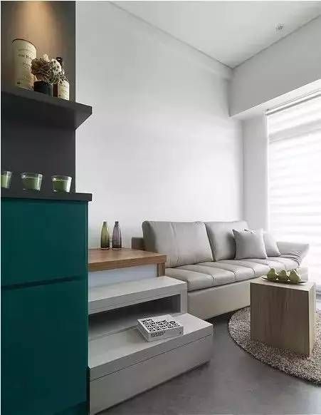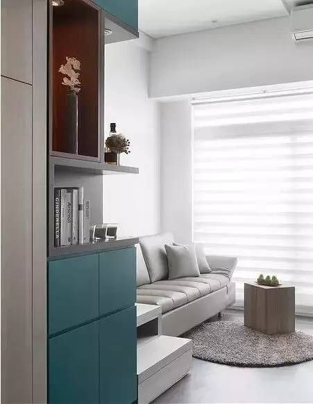 21㎡挑高3米6的空间,设计师将空间里“小”与“高”的特性,结合树屋的概念,成为设计的趣味和亮点。空间以地中海蓝色的柜体为轴心,三段式阶梯向上旋转到卧室,每一节楼梯都是收纳空间。