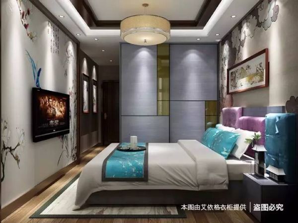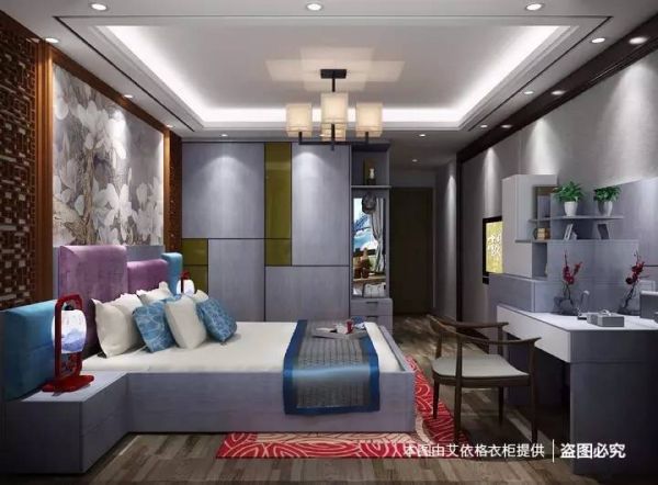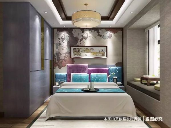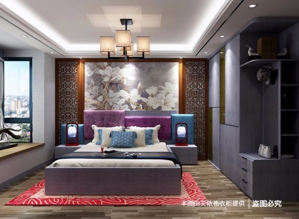紫灰色与白色拼接的家具与中式软装搭配十分恰当,在氛围上相互融合、相互烘托,让卧室颇有大家闺秀之风。玻璃材质的衔接让衣柜多了一份时尚感,床头的软包设计增加了躺在床上看书看电视的舒适性,背景墙的装饰充满了古风古韵,梳妆台的造型十分别致,为整洁的桌面提供了细致的收纳空间。