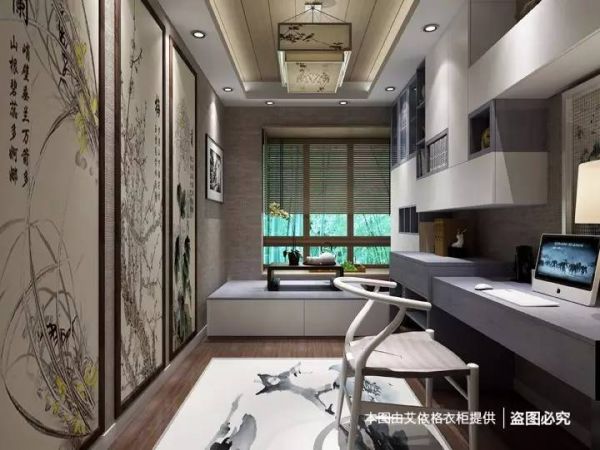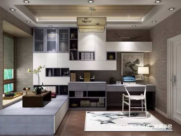 书柜、榻榻米、飘窗完美和谐的组合在一室之中,三幅书法国画将人一下子带到艺术的空间,灰紫色与白色面板拼接的书柜造型独特,便于放置多种多样的装饰品和书,榻榻米连着飘窗看着非常宽敞,铺上被子就是一张床,而且榻榻米本身也拥有超强收纳空间,让书房变身多功能室。