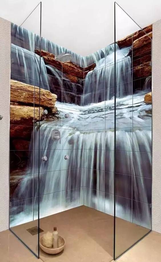 瀑布飞流而下,在哗啦啦的流水声中冲澡,