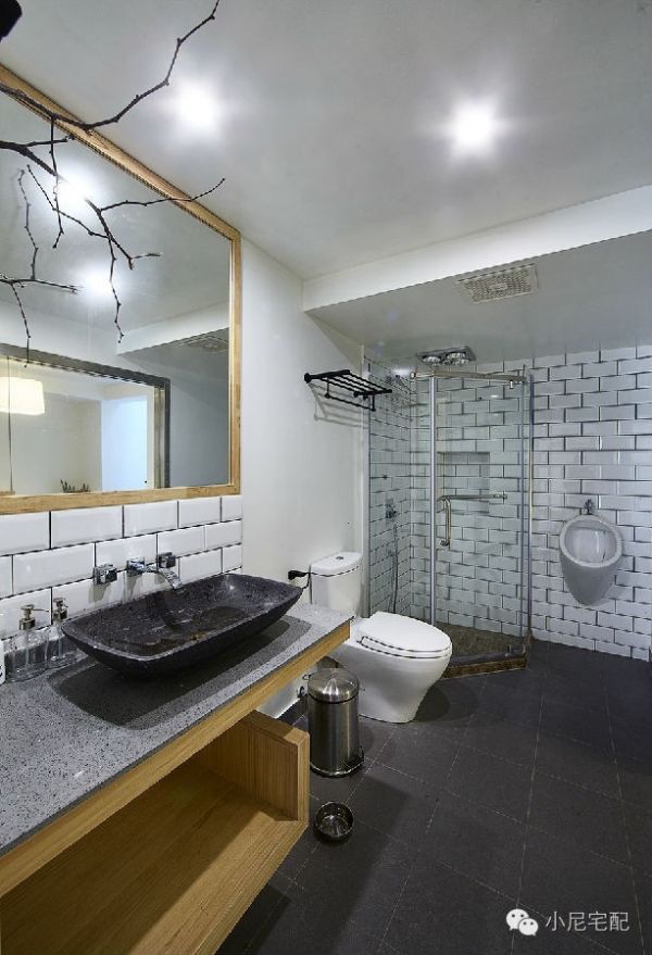 ▲大大的镜面给空间一种延伸感,拼接瓷砖又能调和原木的沉重。