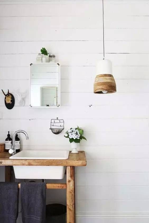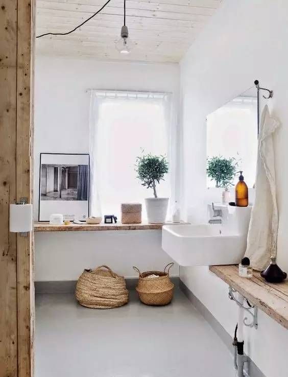 2.卫生间以白色为主体,局部用木色点缀,可以是搁板、柜子,也可以用同色系的收纳筐、灯具等;