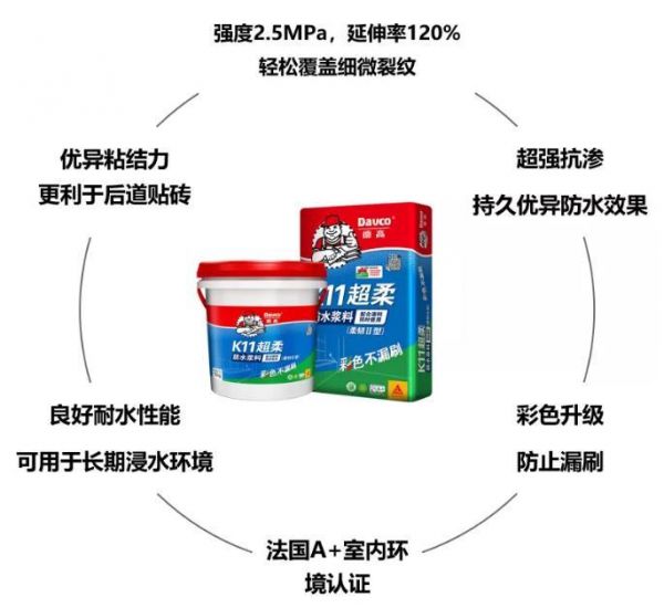 德高K11彩色超柔防水浆料40KG大包装,彩色升级不漏刷,一抹开启“蓝墙绿地”防水新时代。