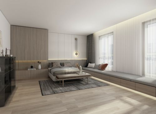 由于这个小区统一在每家每户的天花板上都装有毛细管网以维持室内恒温恒湿,所以设计师在设计的时候尽可能地弱化了顶面的处理,而是通过墙面处理来中和空间的层次,木质材料被大量运用。
