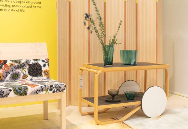 芬兰多树,80%的森林覆盖率让木质结构成为芬兰设计师的挚爱,国宝级品牌Nikari的设计灵感便是源于此。现场展示的NIKARI-ARTE SOHVA 沙发,其外形将北欧传统设计与当代设计结合,把精湛的制作工艺和可持续发展理念融入木质家具中,并采用了芬兰著名插画家Klaus Haapaniemi的经典森林动物图案,丰富又内敛地展现森林的原生之美。配合Nikari展示的设计作品则是来自著名设计品牌Artek的Tea Trolley桌几。 Artek是由有“芬兰设计之父”之称的Alvar Aalto和他的妻子Aino Aalto共同创立的,之所以与Nikari产品搭配展出,是因为在Alvar Aalto生命的最后几年里,Nikari工作室与其有着紧密的合作与联系。在他们的作品中,无论是风格和材质都能带给人关于生活的温馨联想,也同时能展现木的自然、稳重、温馨以及背后的生命力。