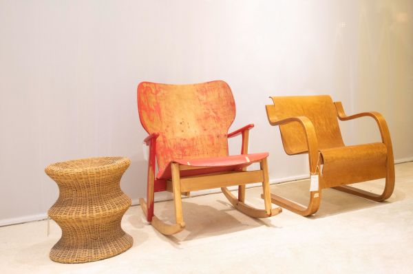 Juttu jakkara蘑菇双凳 阿尼奥 1961年、Domus Lux lounge chair 塔佩瓦拉 1948年、42 birch armchair 42桦木扶手椅 阿尔瓦•阿尔托 1932年(从左至右)