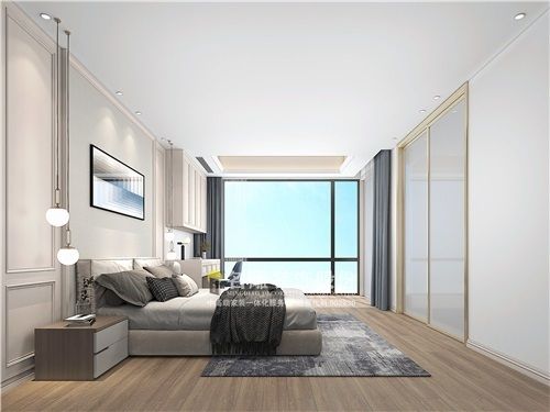 床头背景采用拼色的设计手法,同时也巧妙地将隐形门融入背景墙内。
