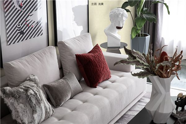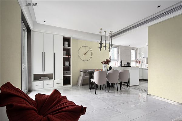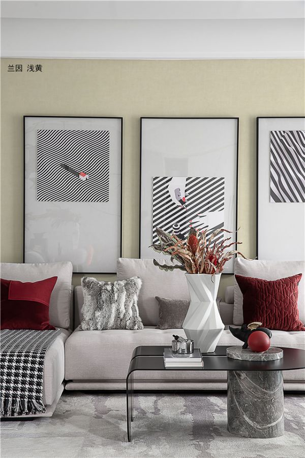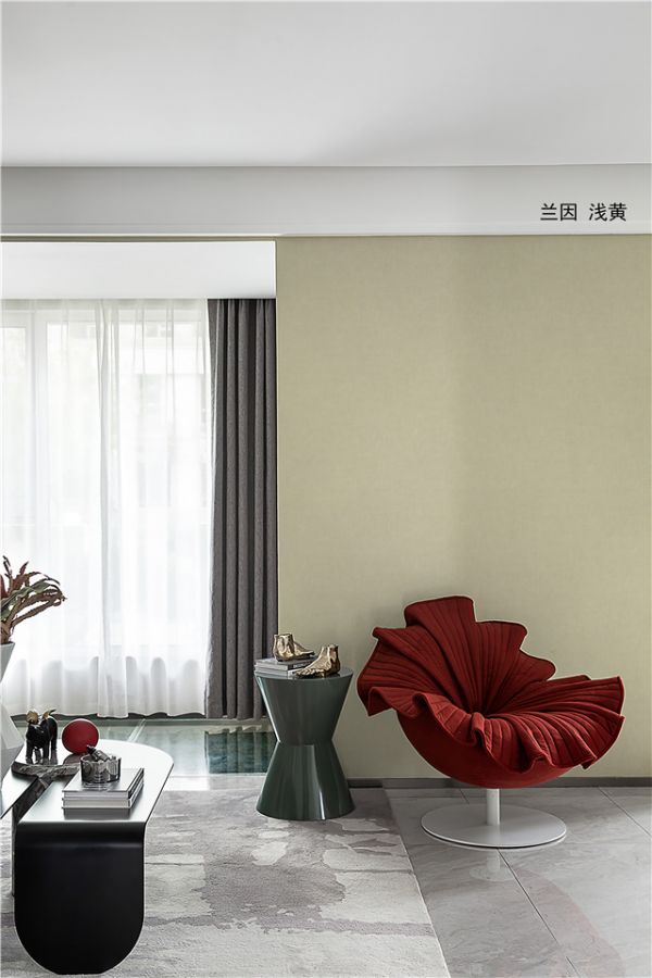 兰因浅黄的墙布,自带温暖、温馨之感,平绒的质地,则更能给空间“加温”。此外,将浅黄作为空间背景色,最大化的彰显了空间温馨优雅气息,暗红色抱枕、沙发椅的加入,在保持空间色彩平衡同时,更注入了一丝活力与激情,令整体空间更显温馨时尚!