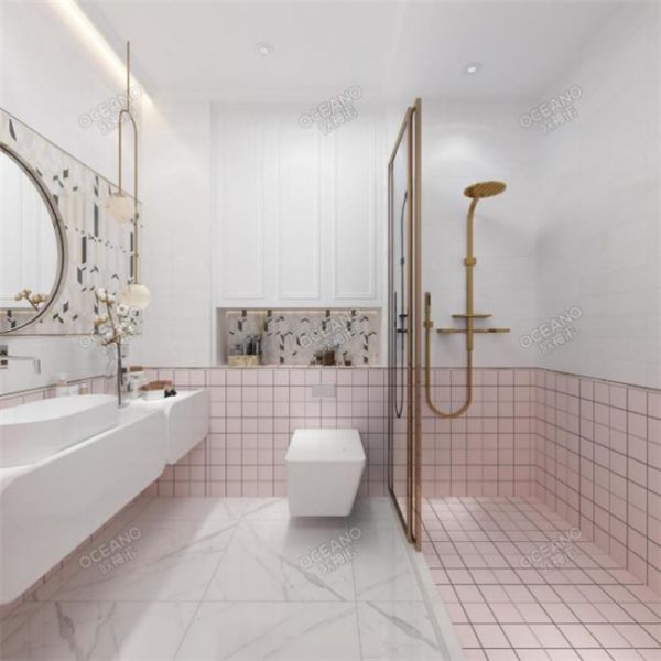 洗手间的干湿功能要有明显的划分,一般分为洗漱和沐浴两个功能区域,其中、“防滑”、“防潮”成为了选地砖的关键。表面过于光滑的砖类,防滑性能差不适合作为入选地砖的队列。洗手间地砖的选择上,会更为考究砖的整体质量和物理性质。