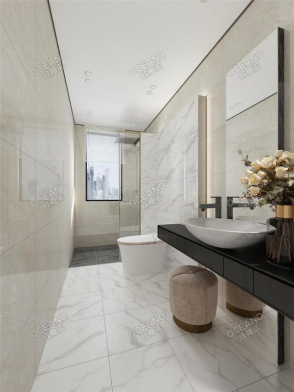 对比光度、厚度、吸水率等参数,小欧准备了以下卫浴空间搭配,为消费者提供参考。