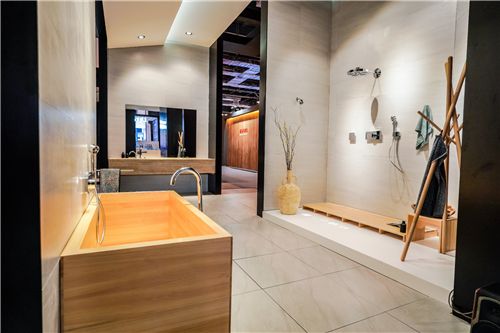 浴室装饰柚木板条,营造出洋溢着自然气息的温馨、闲适且热情的环境。奢华金色外观的AXOR ONE系列与同样是Barber & Osgerby设计的AXOR雅生通用圆形配件配搭,流露出奢华的质感,提供兼具私密性与开放性的空间。