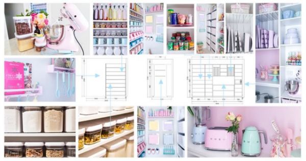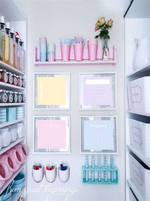 在厨房储藏间的过道尽头贴着4个计划表,分别是菜单、日历、待办事项和购物清单,上下还有家里多出的纸杯、吸管作为“点缀”,马卡龙色系让人心情都跟着舒畅了不少。