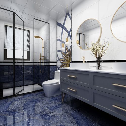 蓝色与白色的搭配使浴室保持明亮和优雅,多瑙蓝自然流畅的纹理更是为空间增加了视觉张力,颜色层层深浅相间。镜子上、柜子上的金属元素缀衬出低调雅奢的氛围,流淌着清新自然的气息。