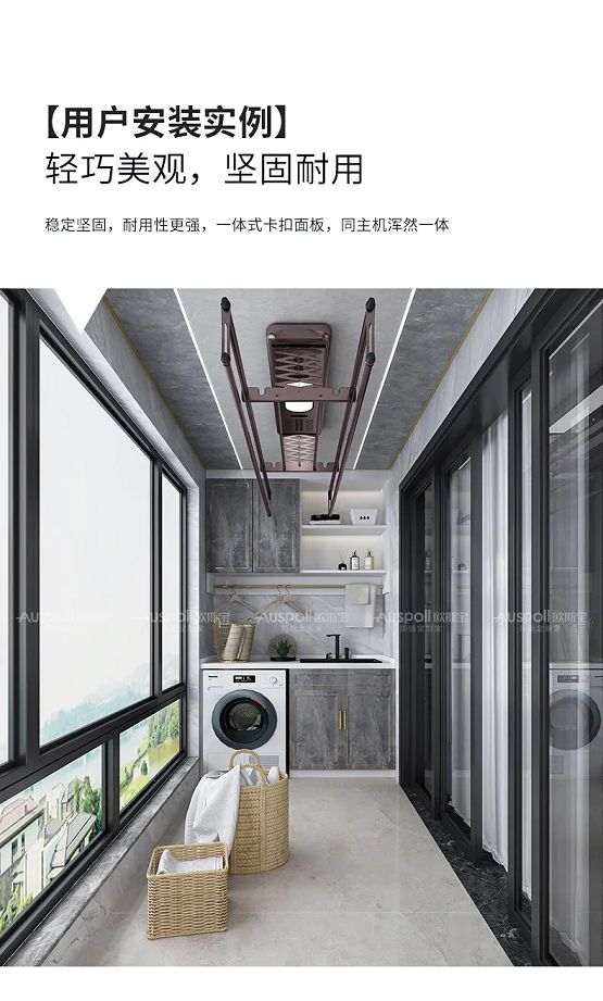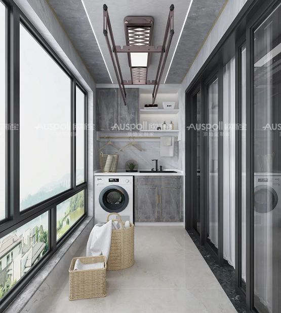 阳台主要起到晾晒衣物的作用,但随着生活指数的不断提高,人们对家居的整体装修越来越重视,任何一个区域既能实现基础功能同时又极具观感,实现空间运用最大化。欧斯宝用心打造整体阳台设计方案,智能晾衣架成家居阳台必备单品,“智”美呈现,一键解决晾晒烦恼!
