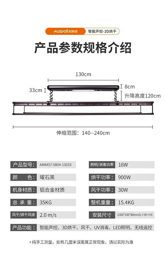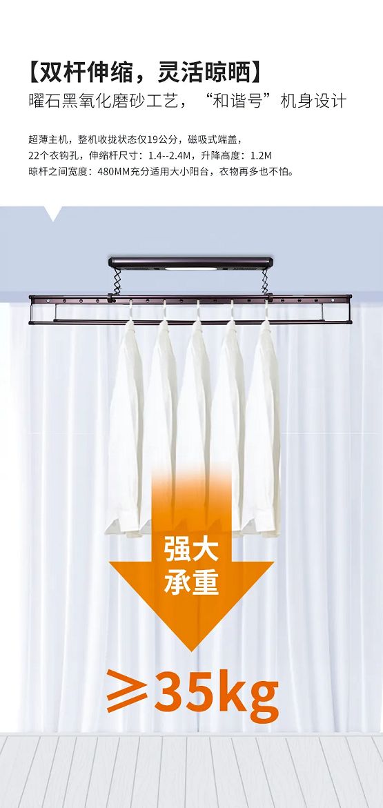 超薄主机,整机收拢状态仅19公分,磁吸式端盖,22个衣钩孔,最高承重35kg,双杆灵活伸缩,伸缩杆尺寸:1.4--2.4m,升降高度:1.2m,晾杆之间宽度:480mm充分适用大小阳台,同样空间晾的更多,衣物再多也不怕。