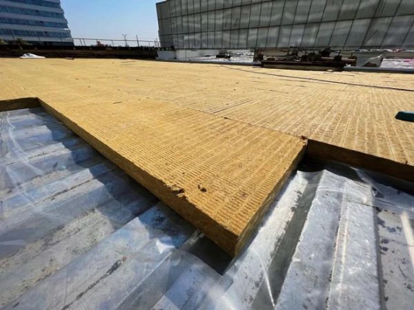铺设隔汽层并用胶带搭接,岩棉保温板错缝铺设并机械固定。