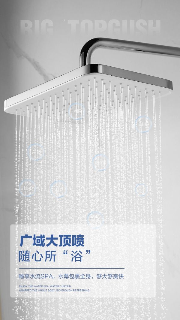7、顶喷设计:超大顶喷,长方形顶喷与主体“前呼后应”,带来沉浸式沐浴体验;