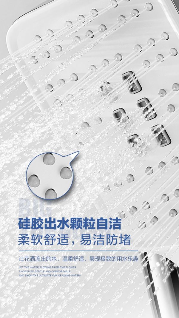 8、出水设计:硅胶出水颗粒,柔软舒适,水花细密,不飞溅;