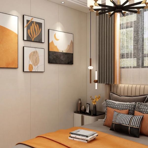 主卧室的床头柜和床头靠背结合在了一起,两侧长长的简约挂灯让整个房间更显潮流。墙画采用了跳跃的橙色系和床品的颜色一致,看起来就很有档次。