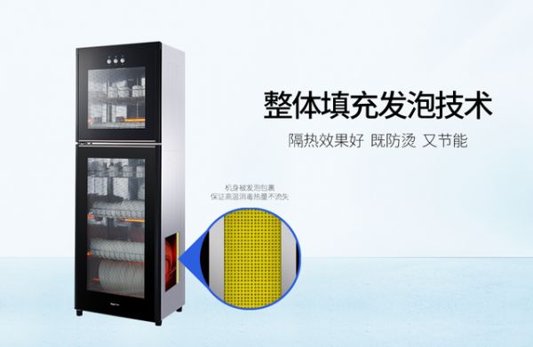 索奇ZTP388-1消毒柜,在每次一处使用细节体现关爱,为了避免高温消毒时热量流失,整机内部采用一体成型发泡技术,发泡环保,厚实均匀,隔热效果好,既防烫又节能。