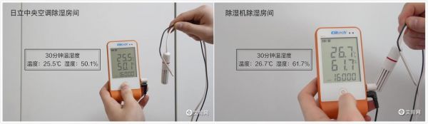广州地区雨后空气湿度可达100%,一场“比拼”就在这里进行。一沿江小区的两个同样的房间内,分别放置除湿机与日立中央空调,测得初始湿度为78.8%和76.8%,测试正式开始。运行30分钟后,日立温湿双控内机就已经达到了设定湿度值50%,而摆放除湿机的房间内,一个小时测得室内湿度仍然为60.7%。